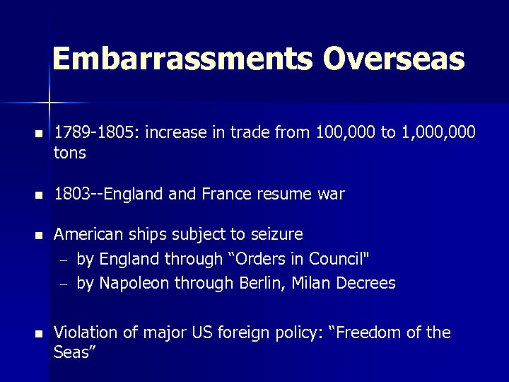 Embarrassments Overseas n 1789 -1805: increase in trade from 100, 000 to 1, 000 tons n 1803 --England France resume war n American ships subject to seizure – by England through “Orders in Council" – by Napoleon through Berlin, Milan Decrees n Violation of major US foreign policy: “Freedom of the Seas”