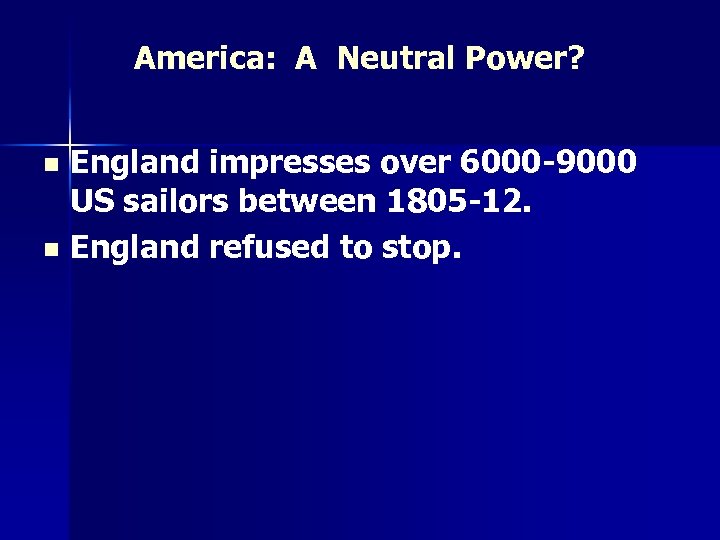 America: A Neutral Power? England impresses over 6000 -9000 US sailors between 1805 -12. n England refused to stop. n