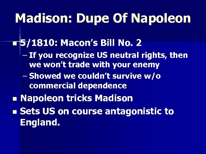 Madison: Dupe Of Napoleon n 5/1810: Macon’s Bill No. 2 – If you recognize US neutral rights, then we won’t trade with your enemy – Showed we couldn’t survive w/o commercial dependence Napoleon tricks Madison n Sets US on course antagonistic to England. n