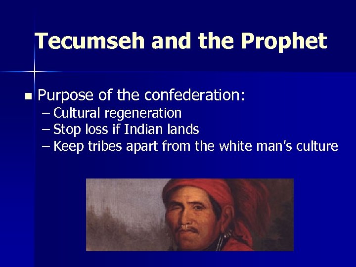 Tecumseh and the Prophet n Purpose of the confederation: – Cultural regeneration – Stop loss if Indian lands – Keep tribes apart from the white man’s culture