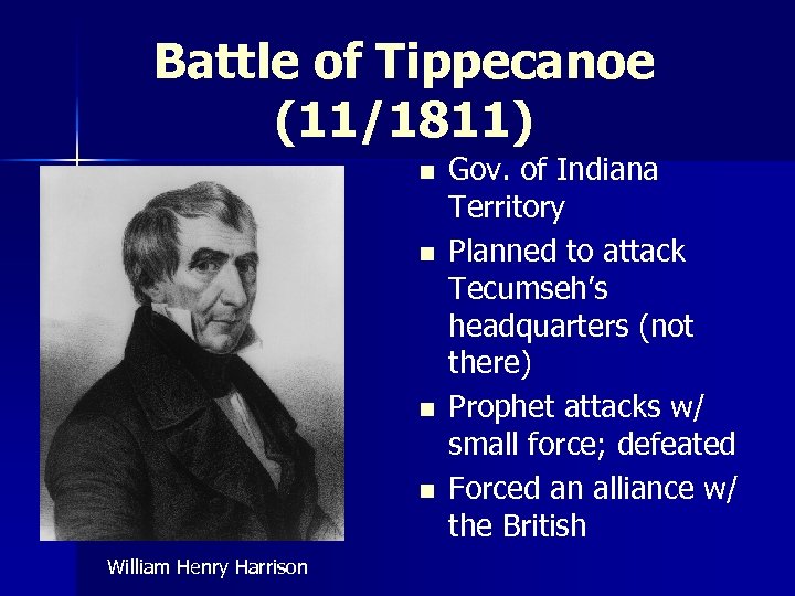 Battle of Tippecanoe (11/1811) n n William Henry Harrison Gov. of Indiana Territory Planned to attack Tecumseh’s headquarters (not there) Prophet attacks w/ small force; defeated Forced an alliance w/ the British