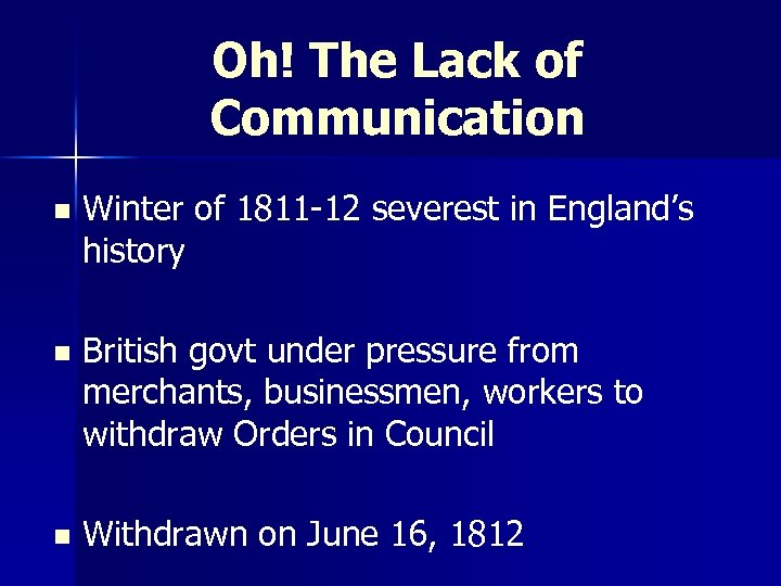 Oh! The Lack of Communication n Winter of 1811 -12 severest in England’s history n British govt under pressure from merchants, businessmen, workers to withdraw Orders in Council n Withdrawn on June 16, 1812