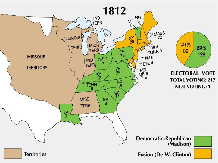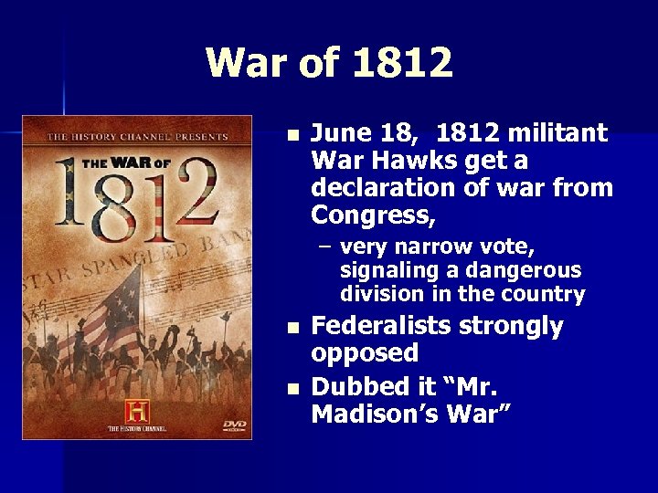War of 1812 n June 18, 1812 militant War Hawks get a declaration of war from Congress, – very narrow vote, signaling a dangerous division in the country n n Federalists strongly opposed Dubbed it “Mr. Madison’s War”