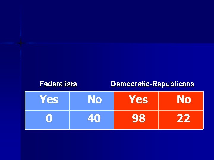 Federalists Democratic-Republicans Yes No 0 40 98 22