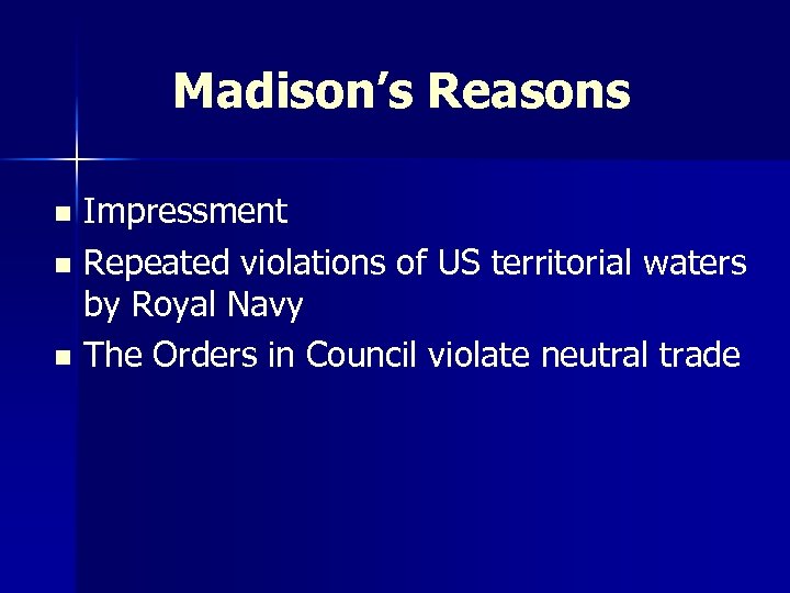 Madison’s Reasons n n n Impressment Repeated violations of US territorial waters by Royal Navy The Orders in Council violate neutral trade