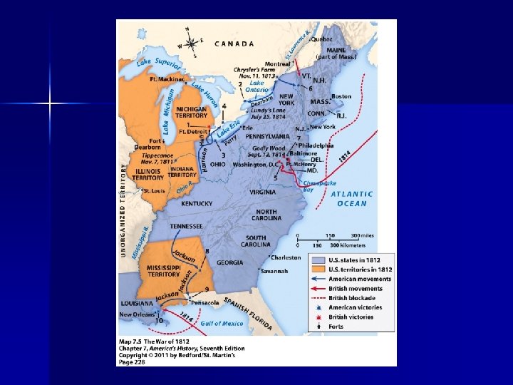 Indian Battles n Nov 1811 General William Henry Harrison (9 th president) attacked Tecumseh’s headquarters at Tippecanoe Indiana n 1814 Andrew Jackson (7 th President) crushed Creek Indians at Battle of Horseshoe Bend (Alabama) – Significance?
