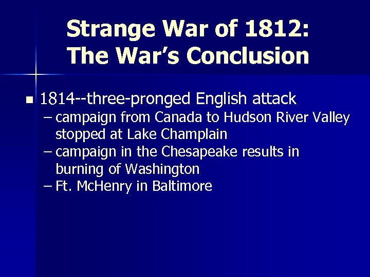 Strange War of 1812: The War’s Conclusion n 1814 --three-pronged English attack – campaign from Canada to Hudson River Valley stopped at Lake Champlain – campaign in the Chesapeake results in burning of Washington – Ft. Mc. Henry in Baltimore