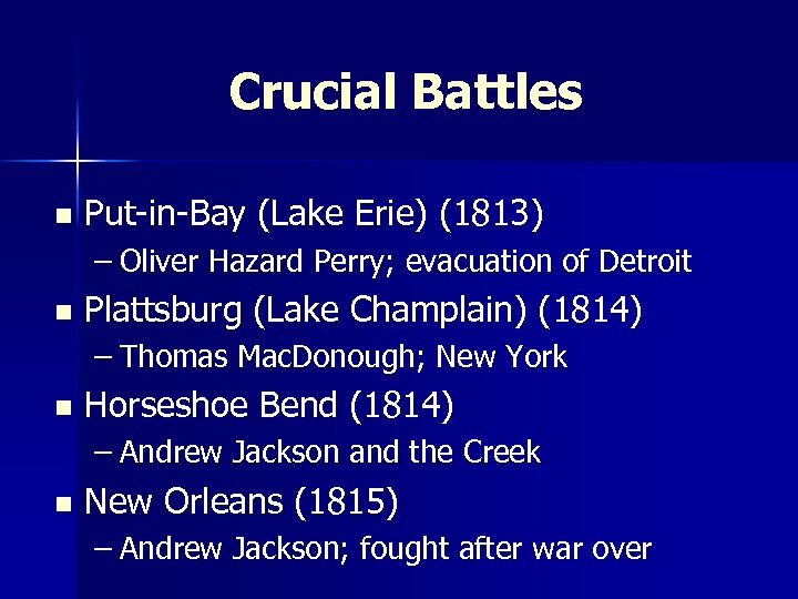 Crucial Battles n Put-in-Bay (Lake Erie) (1813) – Oliver Hazard Perry; evacuation of Detroit n Plattsburg (Lake Champlain) (1814) – Thomas Mac. Donough; New York n Horseshoe Bend (1814) – Andrew Jackson and the Creek n New Orleans (1815) – Andrew Jackson; fought after war over