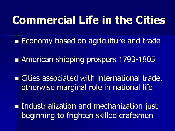 Commercial Life in the Cities n Economy based on agriculture and trade n American shipping prospers 1793 -1805 n Cities associated with international trade, otherwise marginal role in national life n Industrialization and mechanization just beginning to frighten skilled craftsmen