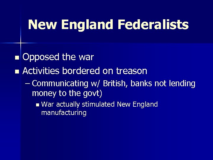 New England Federalists Opposed the war n Activities bordered on treason n – Communicating w/ British, banks not lending money to the govt) n War actually stimulated New England manufacturing