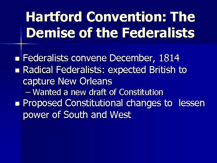 Hartford Convention: The Demise of the Federalists convene December, 1814 n Radical Federalists: expected British to capture New Orleans n – Wanted a new draft of Constitution n Proposed Constitutional changes to lessen power of South and West