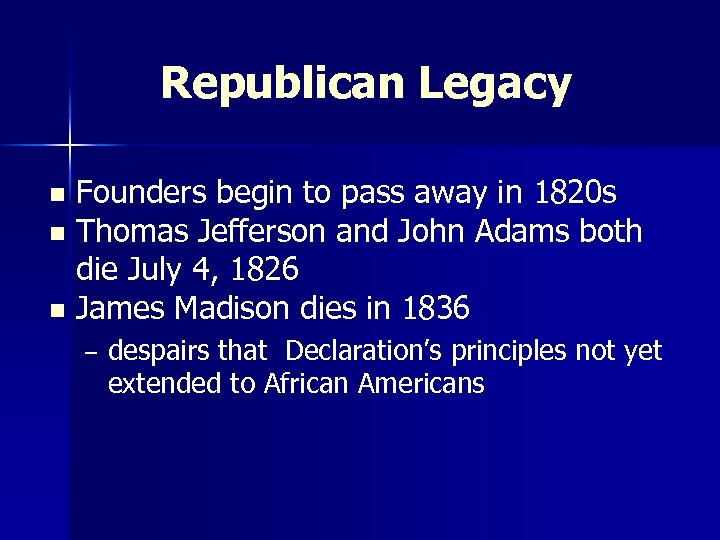 Republican Legacy Founders begin to pass away in 1820 s n Thomas Jefferson and John Adams both die July 4, 1826 n James Madison dies in 1836 n – despairs that Declaration’s principles not yet extended to African Americans