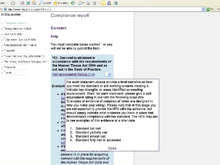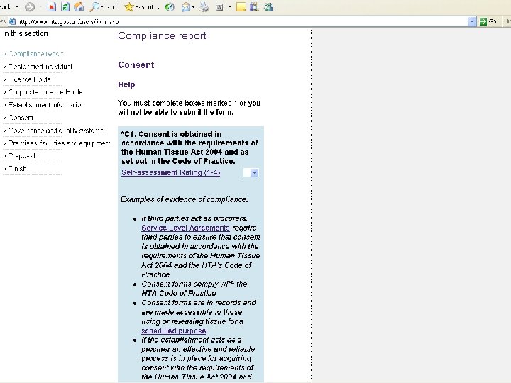 Compliance report and guidance notes l Compliance report l l l l Establishment Information Designated Individual Licence holder (corporate or individual) Consent – 3 standards Governance and Quality Systems – 8 standards Premises, Facilities and Equipment – 5 standards Disposal – 2 standards Guidance l l l Website Licensing FAQs A guide to licensing for DIs and Licence Holders Application guidance Telephone and email advice
