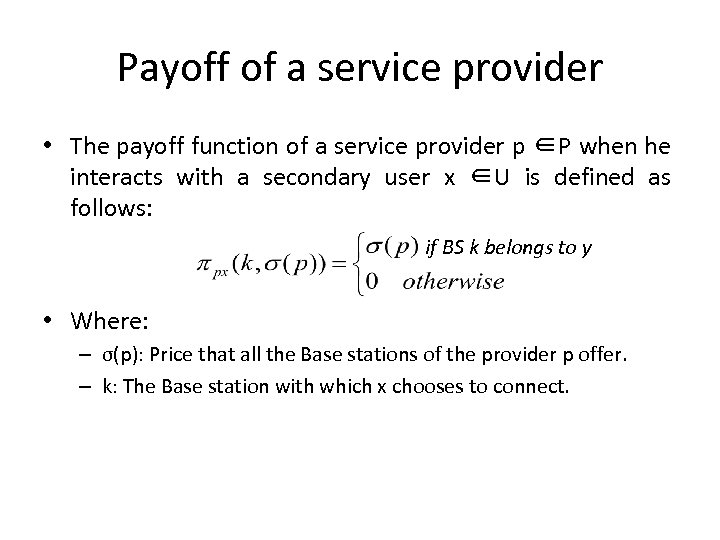 Payoff of a service provider • The payoff function of a service provider p ∈P when he interacts with a secondary user x ∈U is defined as follows: if BS k belongs to y • Where: – σ(p): Price that all the Base stations of the provider p offer. – k: The Base station with which x chooses to connect.