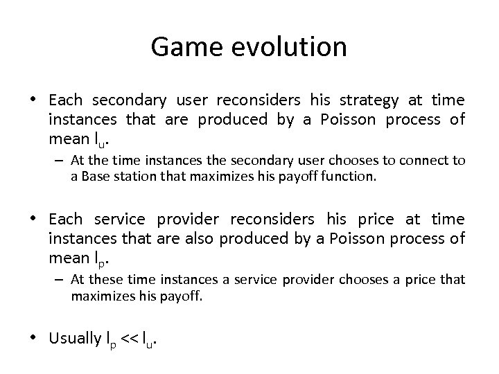 Game evolution • Each secondary user reconsiders his strategy at time instances that are produced by a Poisson process of mean lu. – At the time instances the secondary user chooses to connect to a Base station that maximizes his payoff function. • Each service provider reconsiders his price at time instances that are also produced by a Poisson process of mean lp. – At these time instances a service provider chooses a price that maximizes his payoff. • Usually lp << lu.