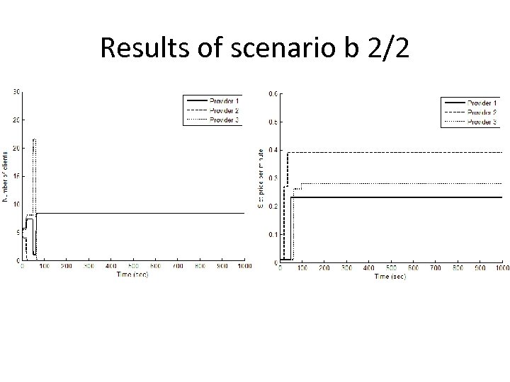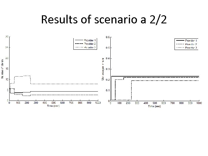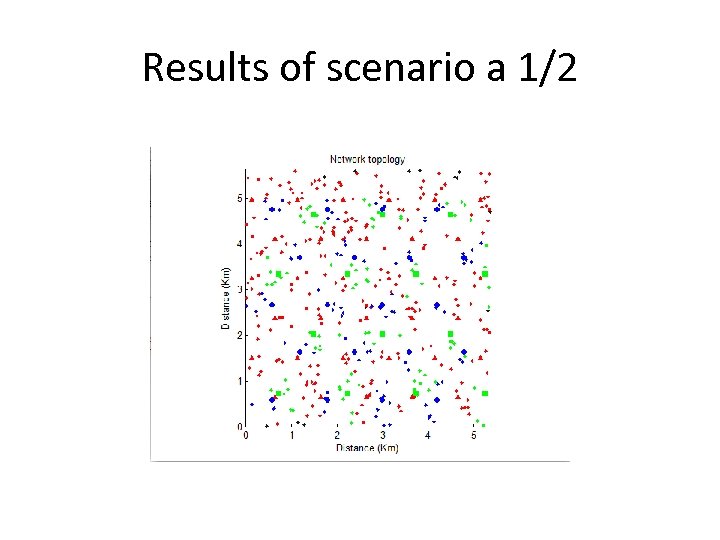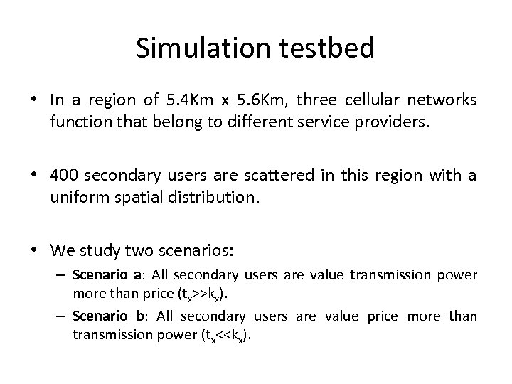 Simulation testbed • In a region of 5. 4 Km x 5. 6 Km, three cellular networks function that belong to different service providers. • 400 secondary users are scattered in this region with a uniform spatial distribution. • We study two scenarios: – Scenario a: All secondary users are value transmission power more than price (tx>>kx). – Scenario b: All secondary users are value price more than transmission power (tx<<kx).
