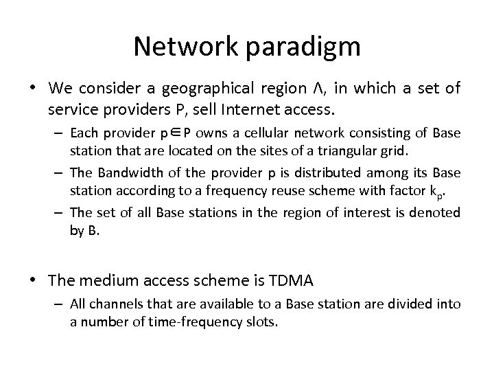 Network paradigm • We consider a geographical region Λ, in which a set of service providers P, sell Internet access. – Each provider p∈P owns a cellular network consisting of Base station that are located on the sites of a triangular grid. – The Bandwidth of the provider p is distributed among its Base station according to a frequency reuse scheme with factor kp. – The set of all Base stations in the region of interest is denoted by B. • The medium access scheme is TDMA – All channels that are available to a Base station are divided into a number of time-frequency slots.