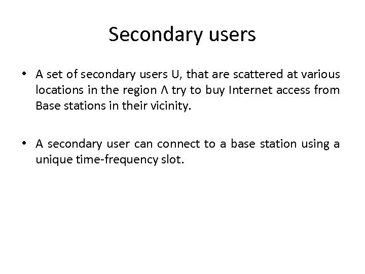 Secondary users • A set of secondary users U, that are scattered at various locations in the region Λ try to buy Internet access from Base stations in their vicinity. • A secondary user can connect to a base station using a unique time-frequency slot.