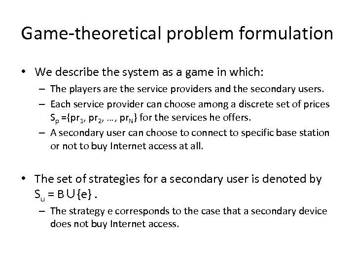 Game-theoretical problem formulation • We describe the system as a game in which: – The players are the service providers and the secondary users. – Each service provider can choose among a discrete set of prices Sp ={pr 1, pr 2, …, pr. N} for the services he offers. – A secondary user can choose to connect to specific base station or not to buy Internet access at all. • The set of strategies for a secondary user is denoted by Su = B∪{e}. – The strategy e corresponds to the case that a secondary device does not buy Internet access.