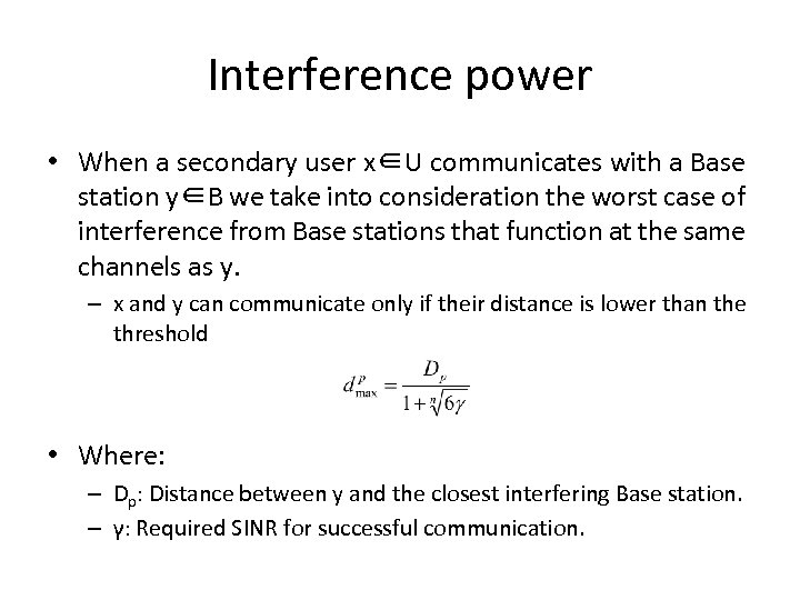 Interference power • When a secondary user x∈U communicates with a Base station y∈B we take into consideration the worst case of interference from Base stations that function at the same channels as y. – x and y can communicate only if their distance is lower than the threshold • Where: – Dp: Distance between y and the closest interfering Base station. – γ: Required SINR for successful communication.