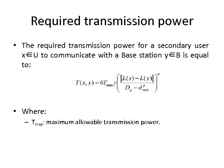 Required transmission power • The required transmission power for a secondary user x∈U to communicate with a Base station y∈B is equal to: • Where: – Tmax: maximum allowable transmission power.