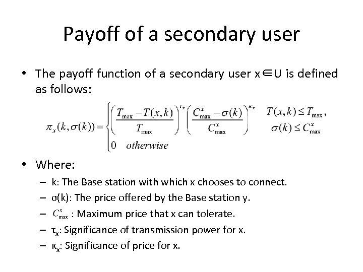 Payoff of a secondary user • The payoff function of a secondary user x∈U is defined as follows: • Where: – – – k: The Base station with which x chooses to connect. σ(k): The price offered by the Base station y. : Maximum price that x can tolerate. τx: Significance of transmission power for x. κx: Significance of price for x.