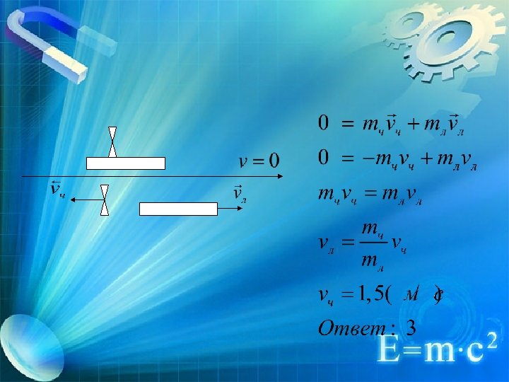Задача 4 Человек массой 50 кг прыгает из неподвижной лодки массой 100 кг на берег с горизонтальной скоростью 3 м/с относительно лодки. Если сопротивление воды движению лодки пренебрежимо мало, то лодка после прыжка человека движется относительно Земли со скоростью 1) 3 м/с; 2) 2 м/с; 3) 1, 5 м/с; 4) 1 м/с.