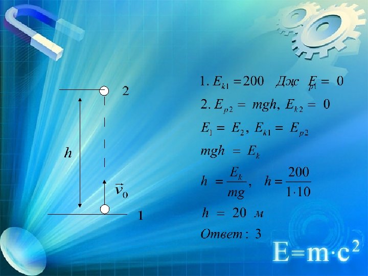 Задача 5 Камень массой 1 кг брошен вертикально вверх. В начальный момент его энергия равна 20 Дж. На какую максимальную высоту поднимается камень. Сопротивлением воздуха пренебречь. 1) 10 м; 2) 200 м; 3) 20 м; 4) 2 м.