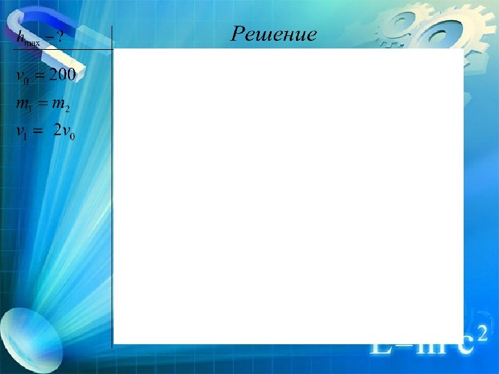 Решение задачи части С: Начальная скорость снаряда, выпущенного из пушки вертикально вверх равна 200 м/с. В точке максимального подъёма снаряд разорвался на два одинаковых осколка. Первый упал на землю вблизи точки выстрела, имея скорость в 2 раза больше начальной скорости снаряда. На какую максимальную высоту поднялся второй осколок? Сопротивлением воздуха пренебречь.