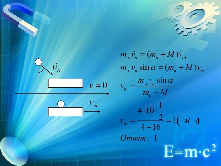 Алгоритм решения задач на закон сохранения импульса : 1. Сделайте чертёж для каждого тела, покажите векторы импульсов. 2. Рассмотрите характер движения системы тел и установите, является ли данная система замкнутой. 3. Запишите закон сохранения для данных тел. 4. Запишите закон сохранения импульса в проекциях на оси. 5. Запишите (при необходимости) дополнительные формулы из кинематики и динамики. 6. Решите полученную систему уравнений относительно искомой величины и проанализируйте результат.