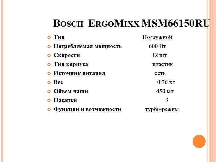 BOSCH ERGOMIXX MSM 66150 RU Тип Погружной Потребляемая мощность 600 Вт Скорости 12 шт Тип корпуса пластик Источник питания сеть Вес 0. 76 кг Объем чаши 450 мл Насадки 3 Функции и возможности турбо-режим