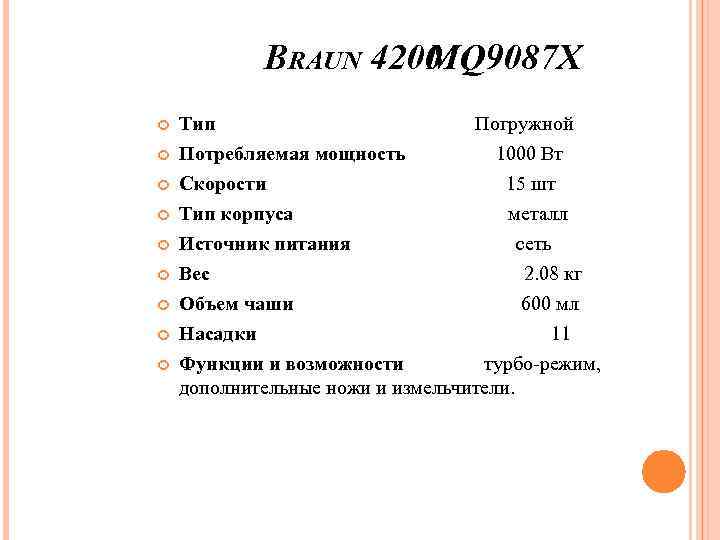 BRAUN 4200 MQ 9087 X Тип Погружной Потребляемая мощность 1000 Вт Скорости 15 шт Тип корпуса металл Источник питания сеть Вес 2. 08 кг Объем чаши 600 мл Насадки 11 Функции и возможности турбо-режим, дополнительные ножи и измельчители.