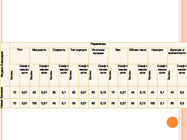 Параметры Новая Базовая Коэф-т весом ости Функции и возможности Баллы Коэф-т весом ости Насадки Баллы Коэф-т весом ости Объем чаши Баллы Коэф-т весом ости Вес Баллы Коэф-т весом ости Источник питания Баллы Коэф-т весом ости Тип корпуса Баллы Коэф-т весом ости Скорости Баллы Коэф-т весом ости Мощность Баллы Модели блендеров Тип Коэф-т весом ости 70 0, 01 60 0, 01 36 0, 1 60 0, 01 80 0, 13 70 0, 01 45 0, 13 40 0, 1 40 0, 3 70 0, 01 100 0, 01 45 0, 1 90 0, 01 80 0, 13 25 0, 01 60 0, 13 100 0, 1 80 0, 3