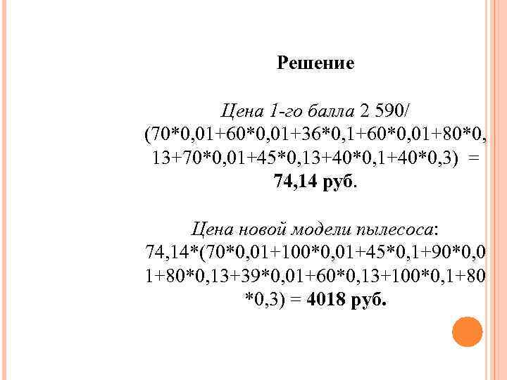 Решение Цена 1 -го балла 2 590/ (70*0, 01+60*0, 01+36*0, 1+60*0, 01+80*0, 13+70*0, 01+45*0, 13+40*0, 1+40*0, 3) = 74, 14 руб. Цена новой модели пылесоса: 74, 14*(70*0, 01+100*0, 01+45*0, 1+90*0, 0 1+80*0, 13+39*0, 01+60*0, 13+100*0, 1+80 *0, 3) = 4018 руб.