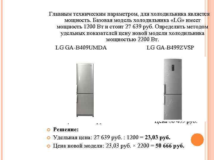 Главным техническим параметром, для холодильника является мощность. Базовая модель холодильника «LG» имеет мощность 1200 Вт и стоит 27 639 руб. Определить методом удельных показателей цену новой модели холодильника мощностью 2200 Вт. LG GA-B 409 UMDA LG GA-B 499 ZVSP Цена 27 639 руб. Цена 80 489 руб. Решение: Удельная цена: 27 639 руб. : 1200 = 23, 03 руб. Цена новой модели: 23, 03 руб. × 2200 = 50 666 руб.