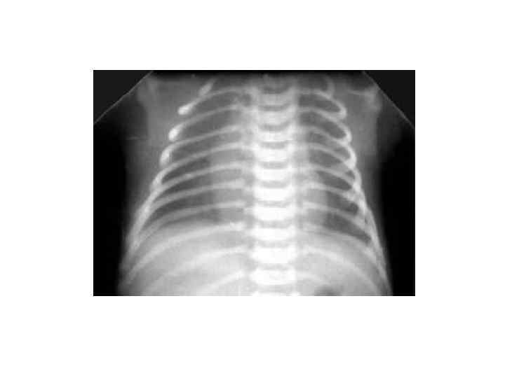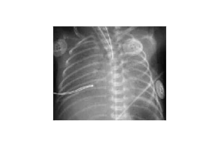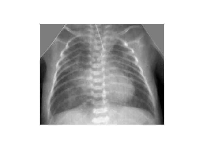 Сегментарные и полисегментарные ателектазы (3 -5 дн) § У относительно зрелых новорожденных § Тяжелое или среднетяжелое течение респираторных нарушений § Способствуют: аспирация, ВЧК, спинальные травмы, передозировка седативных препаратов в родах § Клиника: - ДН с рождения - цианоз постоянный - перкуторно – укорочение перкуторного звука - аускультация – ослабленное дыхание на стороне поражения § Рентгенологически: диффузная гомогенная тень, на фоне которой не виден легочный рисунок, м. б. смещение средостения в больную сторону