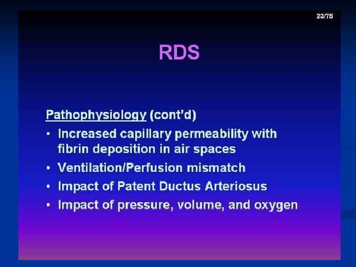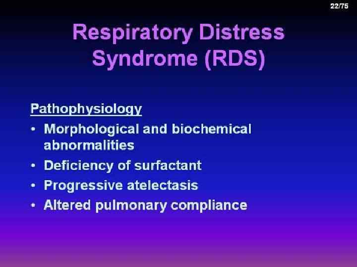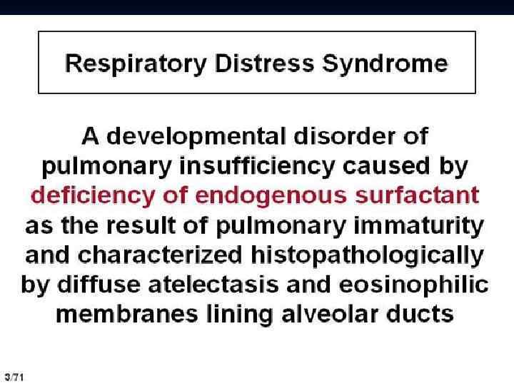 Respiratory distress syndrome RDS – non infection pathology of lung, that is formated intrauterine, intrapartum and during early neonatal period n RDS I type - is same as Hyaline membrane disease (HMD) n RDS is a cause of death of 3080% of infants