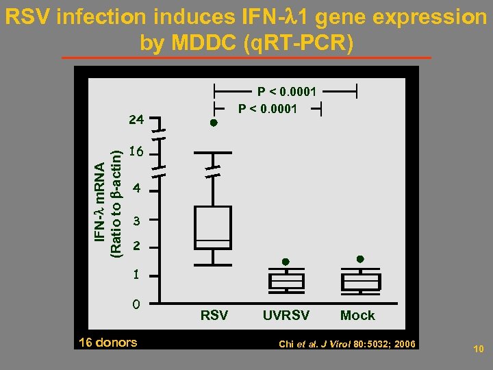 Live RSV stimulates MDDC to secrete IFN- P<0. 0001 450 400 350 IFN- (pg/ml) 200 150 50 40 30 20 10 0 15 donors RSV UVRSV Mock Chi et al. J Virol 80: 5032; 2006 9