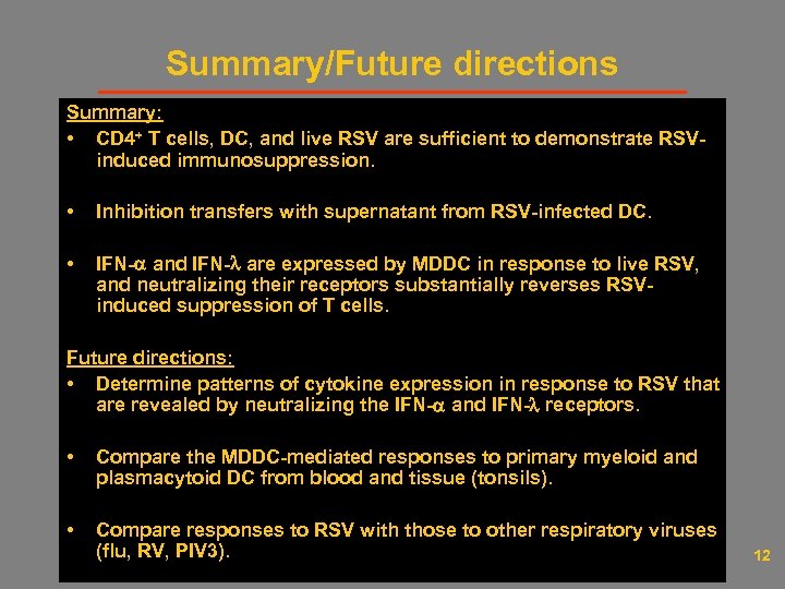 Summary/Future directions Summary: • CD 4+ T cells, DC, and live RSV are sufficient to demonstrate RSVinduced immunosuppression. • Inhibition transfers with supernatant from RSV-infected DC. • IFN- and IFN- are expressed by MDDC in response to live RSV, and neutralizing their receptors substantially reverses RSVinduced suppression of T cells. Future directions: • Determine patterns of cytokine expression in response to RSV that are revealed by neutralizing the IFN- and IFN- receptors. • Compare the MDDC-mediated responses to primary myeloid and plasmacytoid DC from blood and tissue (tonsils). • Compare responses to RSV with those to other respiratory viruses (flu, RV, PIV 3). 12