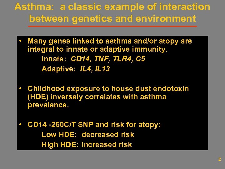 Asthma: a classic example of interaction between genetics and environment • Many genes linked to asthma and/or atopy are integral to innate or adaptive immunity. Innate: CD 14, TNF, TLR 4, C 5 Adaptive: IL 4, IL 13 • Childhood exposure to house dust endotoxin (HDE) inversely correlates with asthma prevalence. • CD 14 -260 C/T SNP and risk for atopy: Low HDE: decreased risk High HDE: increased risk 2