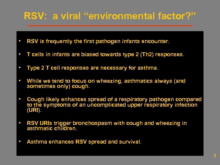 Respiratory syncytial virus (RSV): an environmental factor in the pathogenesis of asthma and allergy Ronald L. Rabin, M. D. CBER/FDA Office of Vaccine Research and Review Laboratory of Immunobiochemistry 1
