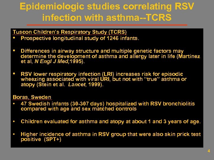 RSV: a viral “environmental factor? ” • RSV is frequently the first pathogen infants encounter. • T cells in infants are biased towards type 2 (Th 2) responses. • Type 2 T cell responses are necessary for asthma. • While we tend to focus on wheezing, asthmatics always (and sometimes only) cough. • Cough likely enhances spread of a respiratory pathogen compared to the symptoms of an uncomplicated upper respiratory infection (URI). • RSV URIs trigger bronchospasm with cough and wheezing in asthmatic children. • Asthma enhances RSV spread and survival. 3