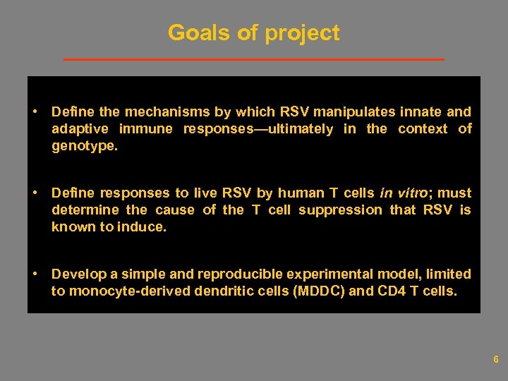 Goals of project • Define the mechanisms by which RSV manipulates innate and adaptive immune responses—ultimately in the context of genotype. • Define responses to live RSV by human T cells in vitro; must determine the cause of the T cell suppression that RSV is known to induce. • Develop a simple and reproducible experimental model, limited to monocyte-derived dendritic cells (MDDC) and CD 4 T cells. 6
