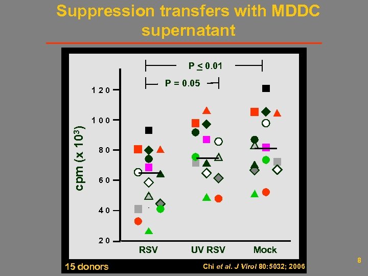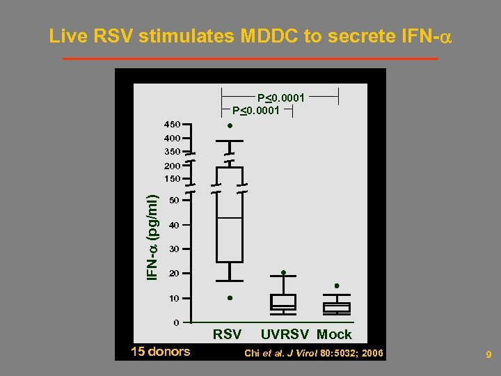 Suppression transfers with MDDC supernatant P < 0. 01 P = 0. 05 120 cpm (x 103) 100 80 60 40 20 15 donors RSV UV RSV Mock Chi et al. J Virol 80: 5032; 2006 8