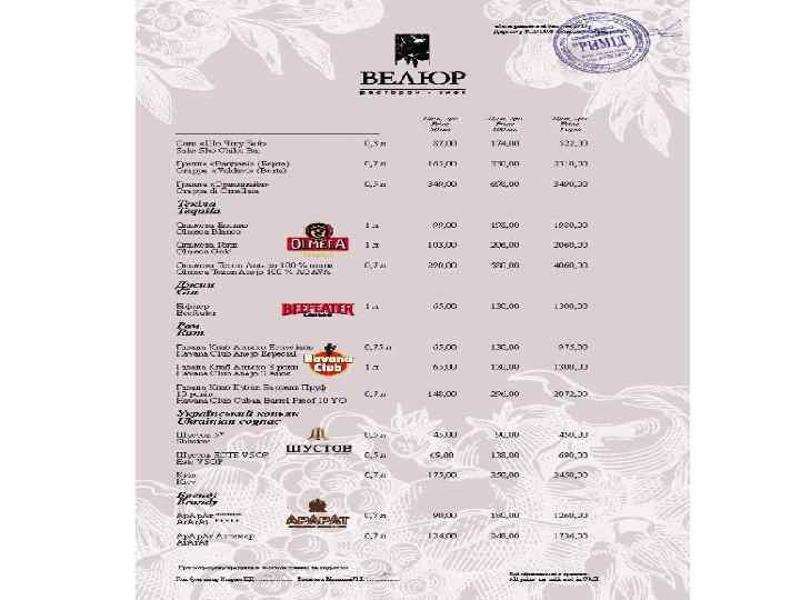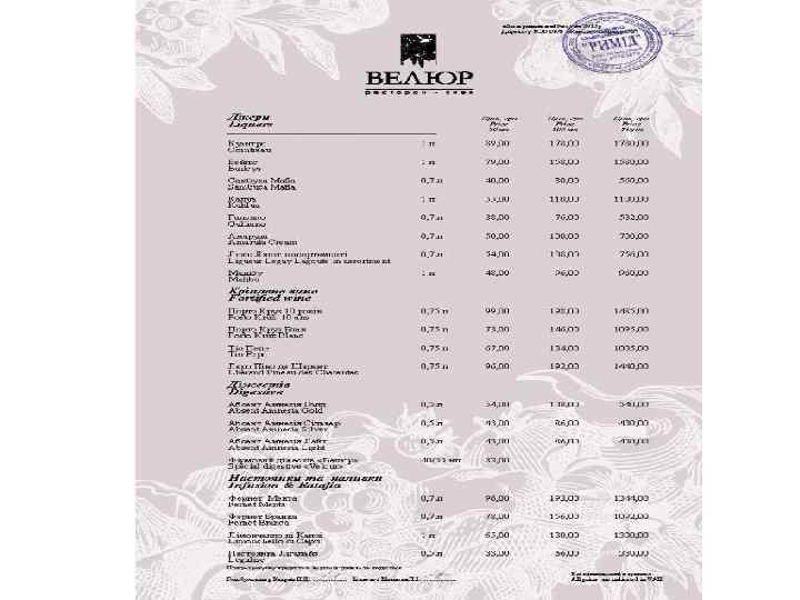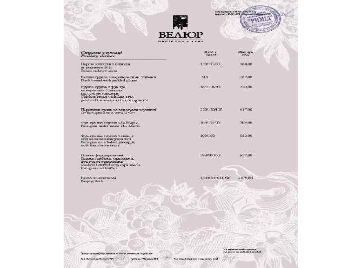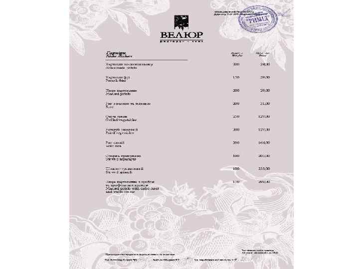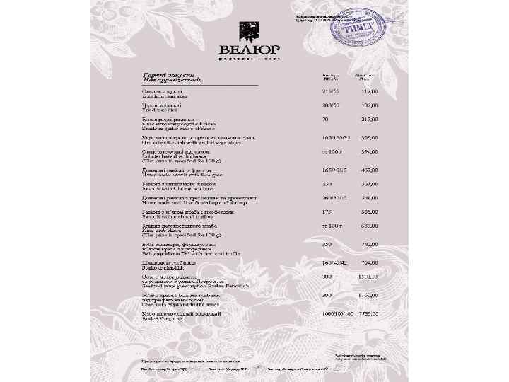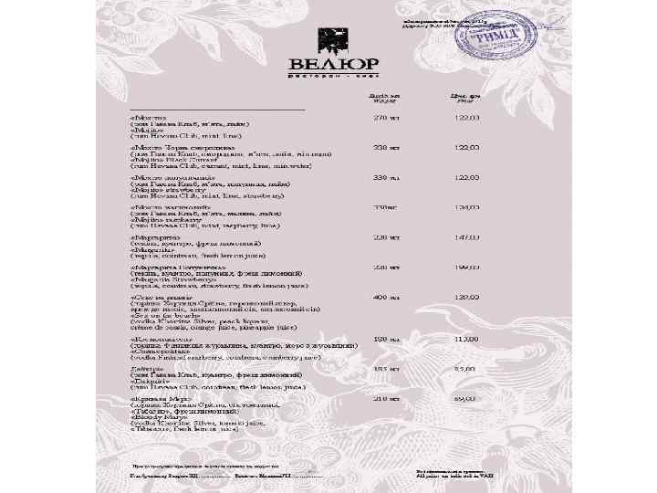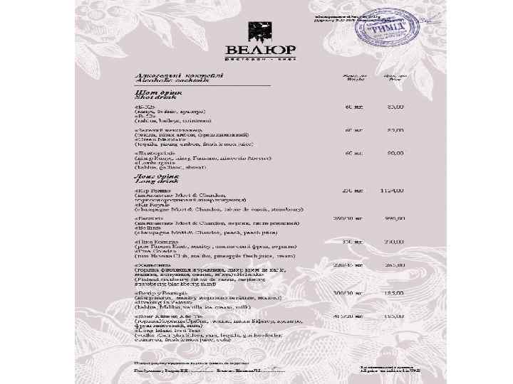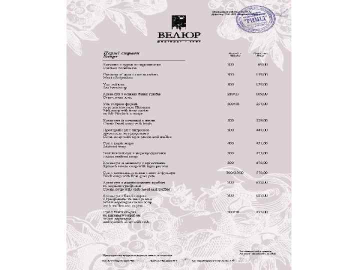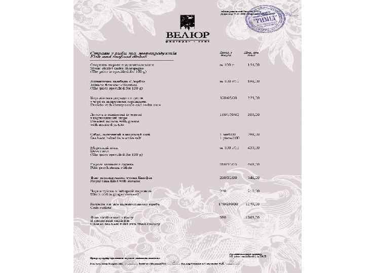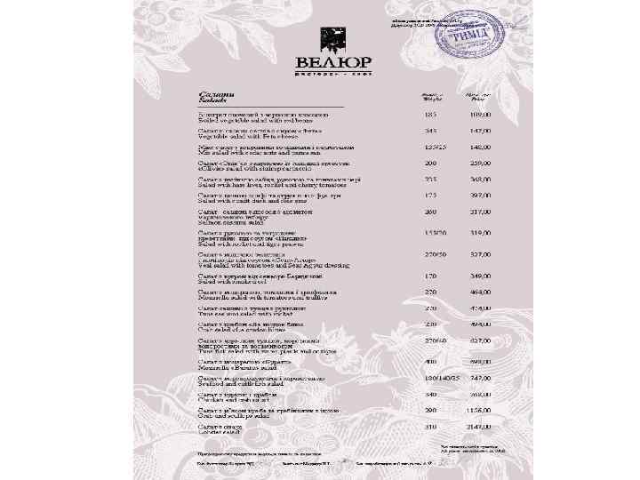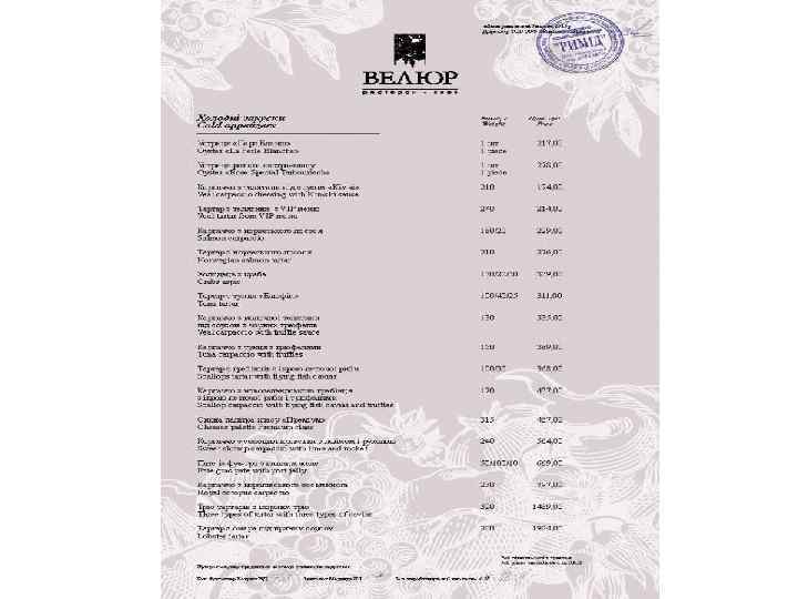Ресторан «Велюр» - найвідоміший ресторан Києва і яскрава зірка Групи компаній «Наша Карта» . Головний принцип роботи ресторану найвищий рівень пропозицій і послуг. Це правило стосується абсолютно всього - від вишуканих страв високої кухні до спеціальних сервісів унікального меню. Усе найкраще зо ресторанного світу ми зібрали в одному закладі щоб кожен раз вас переповнювали незабутні емоції!