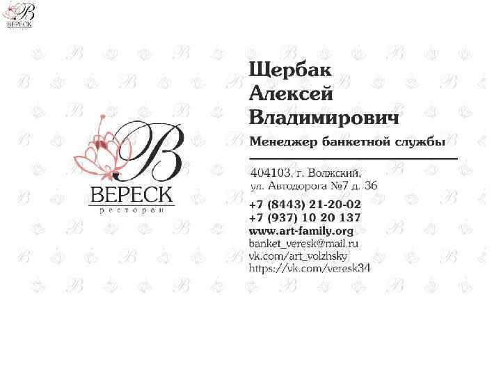 Ресторан “Вереск” г. Волжский, ул. Автодорога № 7, д. 36 8 (8443) 21 -20 -02 Менеджер банкетной службы: 8 -937 -10 -20 -137 Алексей