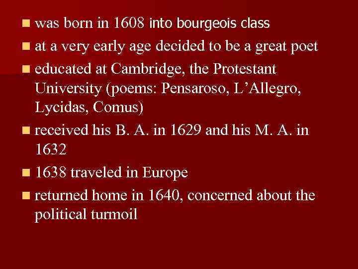 n was born in 1608 into bourgeois class n at a very early age decided to be a great poet n educated at Cambridge, the Protestant University (poems: Pensaroso, L’Allegro, Lycidas, Comus) n received his B. A. in 1629 and his M. A. in 1632 n 1638 traveled in Europe n returned home in 1640, concerned about the political turmoil