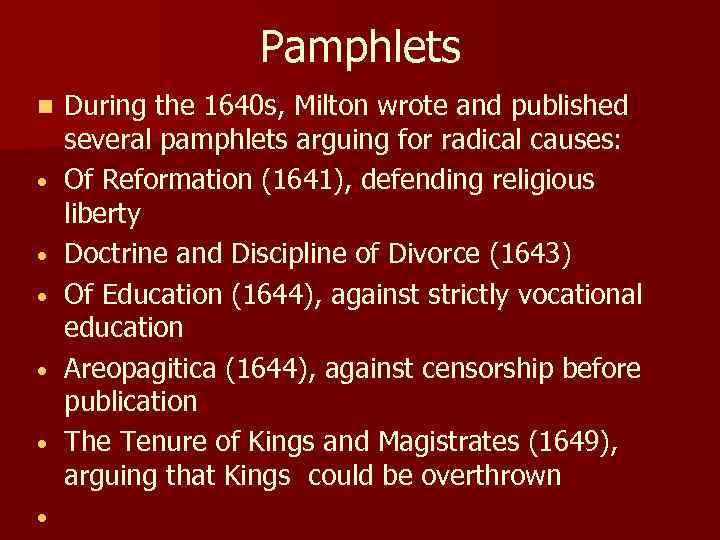Pamphlets n • • • During the 1640 s, Milton wrote and published several pamphlets arguing for radical causes: Of Reformation (1641), defending religious liberty Doctrine and Discipline of Divorce (1643) Of Education (1644), against strictly vocational education Areopagitica (1644), against censorship before publication The Tenure of Kings and Magistrates (1649), arguing that Kings could be overthrown