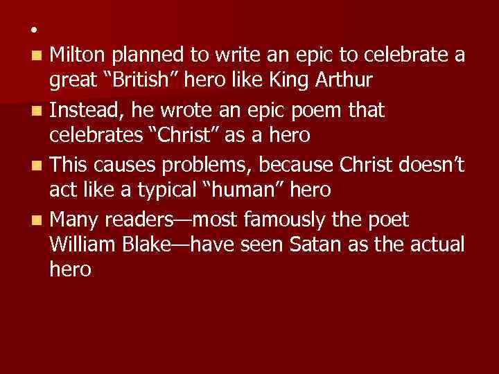 • Milton planned to write an epic to celebrate a great “British” hero like King Arthur n Instead, he wrote an epic poem that celebrates “Christ” as a hero n This causes problems, because Christ doesn’t act like a typical “human” hero n Many readers—most famously the poet William Blake—have seen Satan as the actual hero n