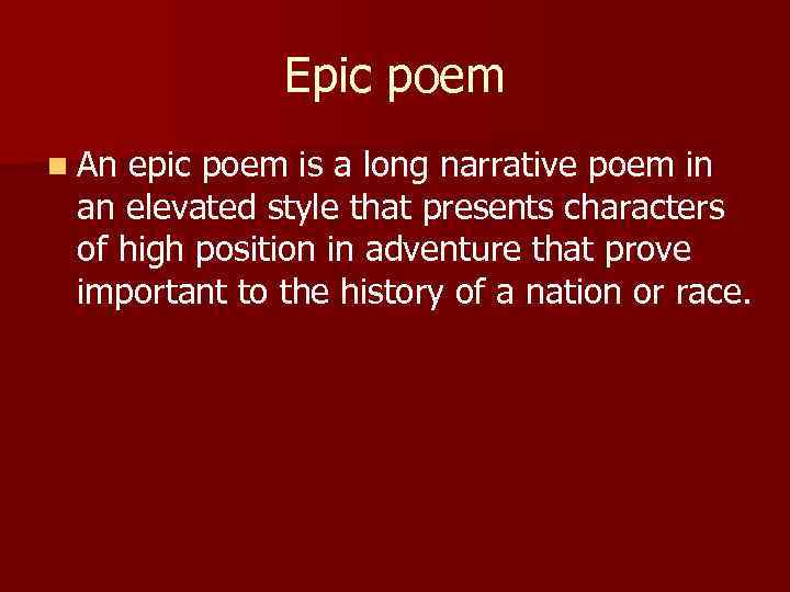 Epic poem n An epic poem is a long narrative poem in an elevated style that presents characters of high position in adventure that prove important to the history of a nation or race.
